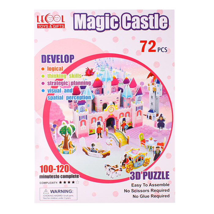 Пазл 3D "Magic Castle" (волшебный замок, 72 элемента). Игрушка включает в себя 4 листа пенокартона с вырубленными элементами, из которых необходимо собрать представленные на картинке фигурки. Упаковка - картонная коробка 22*30*1,2см.