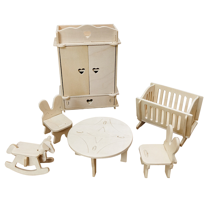 Сборная модель из дерева станет отличным подарком для любого ребенка! Она поможет не только интересно провести время с семьей, но и развить воображение, художественное мышление и мелкую моторику. Собранное изделие можно склеить и раскрасить. Количество деталей: 35 шт. Размеры: стол - 38х80мм; стул - 40х35х56мм; шкаф - 100х46х148мм.