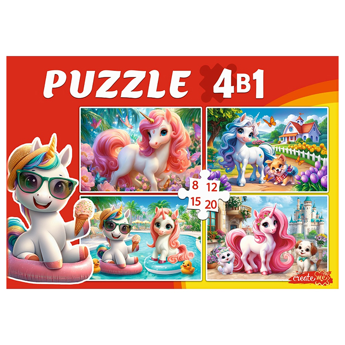 Пазлы 4 в 1 Яркие единороги (8,12,15,20 элементов)