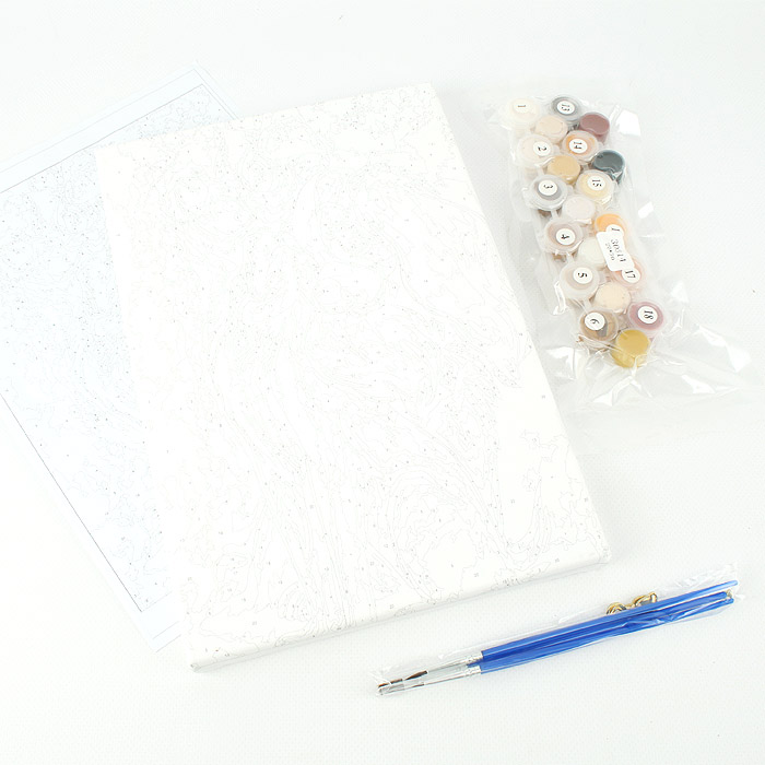 Комплектность: холст на подрамнике, набор акриловых красок, набор кистей, контрольный лист с нанесенной схемой, крепежи для крепления готовой картины.
