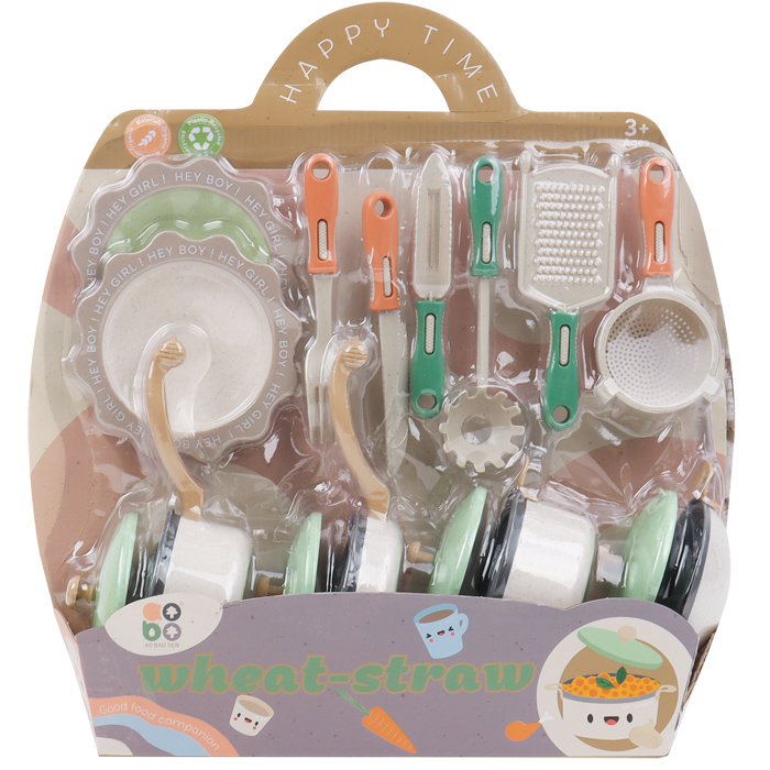 Комплектность 12 предметов : кастрюли, сковородки, тарелочки, кухонная утварь. Упаковка картонный блистер 32,5*33*8см.