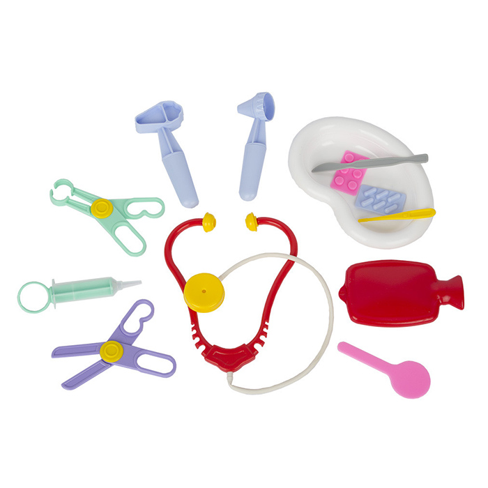 Комплектация: ванночка, грелка, ножницы, шприц, таблетки 2шт, щипцы, термометр, молоток, скальпель, фонендоскоп, ларингоскоп, лопаточка окулиста.