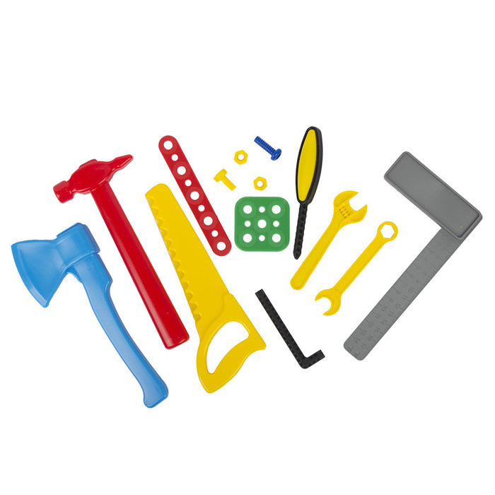 ножовка, топор, молоток, отвертка, шестигранник, ключ гаечный 2шт., пластина 2шт., болт 2шт., гайка 2шт., уголок. Набор из пластмассы.Реалистичные , яркие инструметы и детали заинтересуют ребёнка. Игра с таким набором развивает в ребенке трудолюбие, сюжетно-ролевое мышление, воображение и мелкую моторику, познакомит с названием и назначением инструментов.