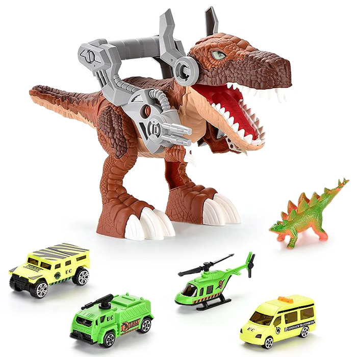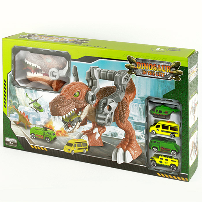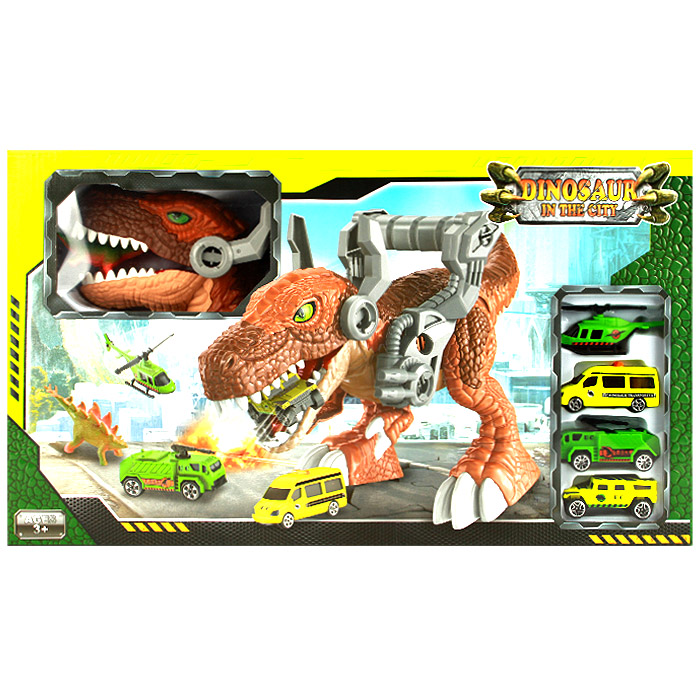 Игровой набор "Dinosaur in the city". Для детей от 3-х лет и старше. Для игровых целей. Изготовлен из полимерных материалов. В наборе: детали динозавра со снаряжением (39х10х20 см), реалистичная фигурка динозавра (8х3х4,5 см), транспорт (верталет - 8 см, 3 машинки - 7см). Схему сборки см. на упаковке. Функции: двигаются лапы, открывается челюсть. Упаковка: коробка 49,5*29*10см