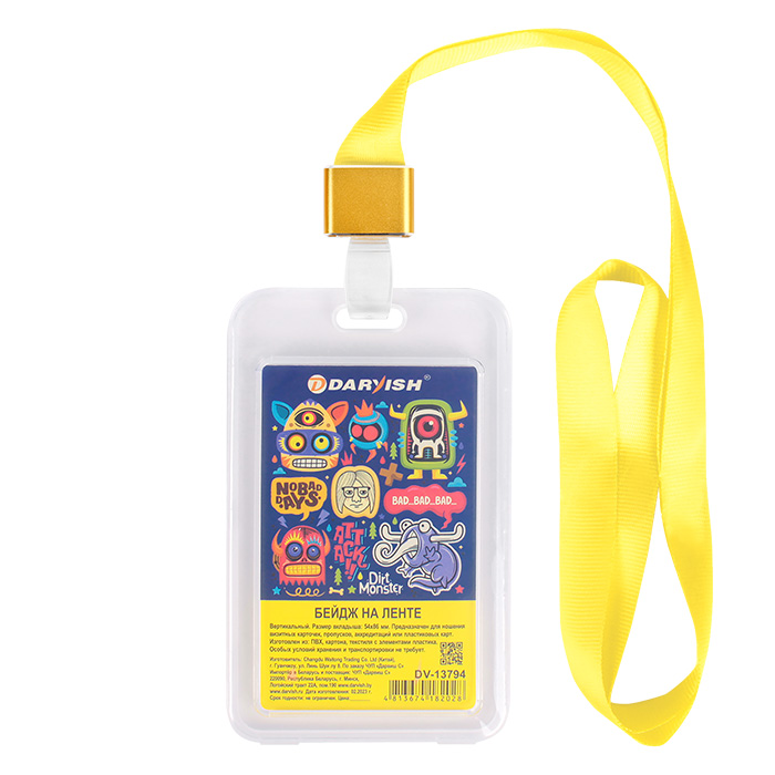 Бейдж на ленте вертикальный прозрачный. Размер вкладыша: 54*86 мм. Предназначен для ношения визитных карточек, пропусков, аккредитаций или пластиковых карт. Длина ленты: 38,5 см, ассорти цвет. Упаковка 20шт ассорти - ПЭ пакет.