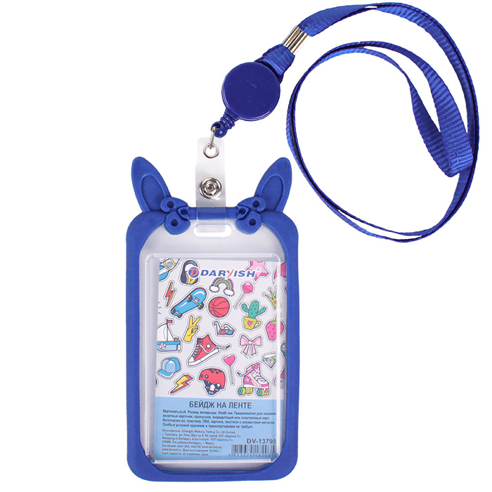 Бейдж на ленте вертикальный с рулеткой. Размер вкладыша: 54*86 мм. Предназначен для ношения визитных карточек, пропусков, аккредитаций или пластиковых карт. Длина ленты 36,5 см, длина нити в держателе-рулетке 40 см. Упаковка 20шт /4 цвета *5шт /- ПЭ пакет.
