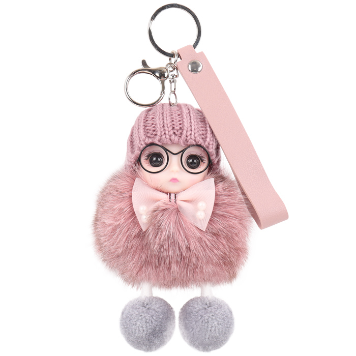 Брелок "Девочка" 4*11*4см   в очках, мех  с бантиком + вязанная шапочка, висячие "ножки-помпон" . Карабин+ кольцо+ ремешок к/з. Упаковка mix цвет 12 шт  п/э