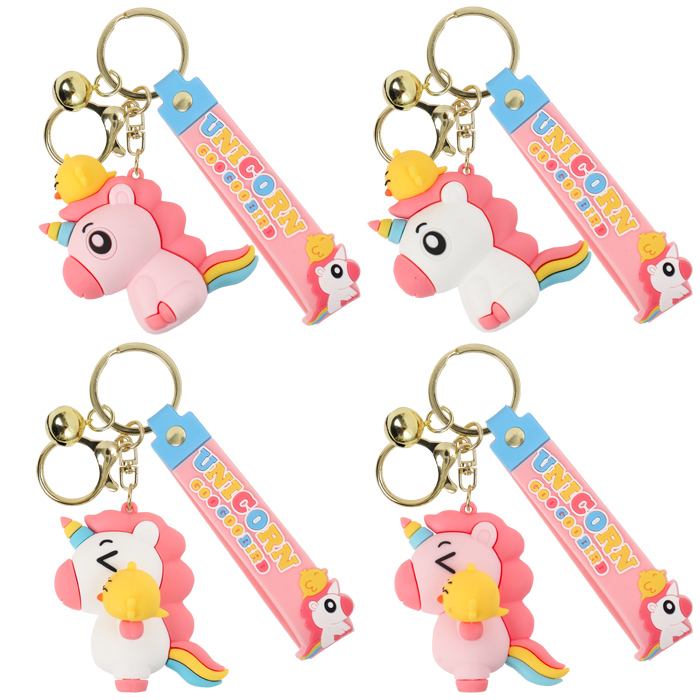 Брелок "Единорог" 5,5*3,5см .Ассорти.  Изготовлен из полимерных материалов с элементами из металла. Дополнительно на кольце силиконовый ремешок с принтом и карабин.