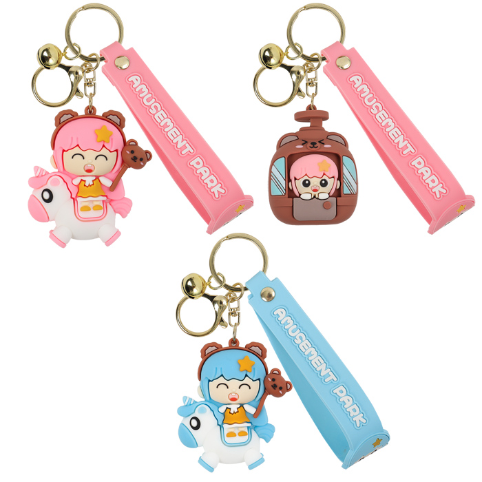 Брелок 4*5*2,5см ассорти.  Изготовлен из полимерных материалов с элементами из металла. Дополнительно на кольце силиконовый ремешок с принтом и карабин.