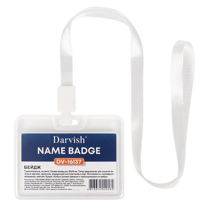 Бейдж на ленте горизонтальный. Размер вкладыша: 85*54 мм. Предназначен для ношения визитных карточек, пропусков, аккредитаций или пластиковых карт. Упаковка 12шт-пакет.