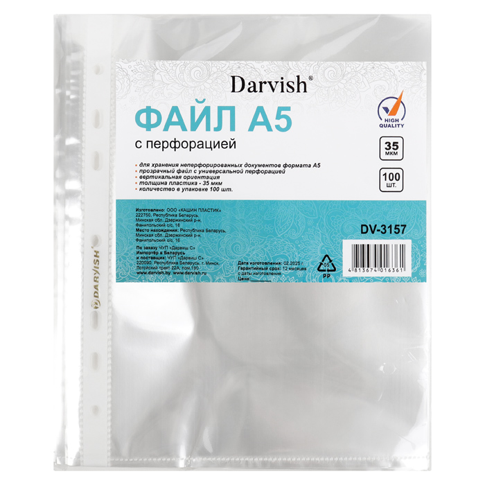 Файл А5 35мкр . Прозрачный файл с универсальной перфорацией. Вертикальная ориентация. Упаковка100шт-пакет