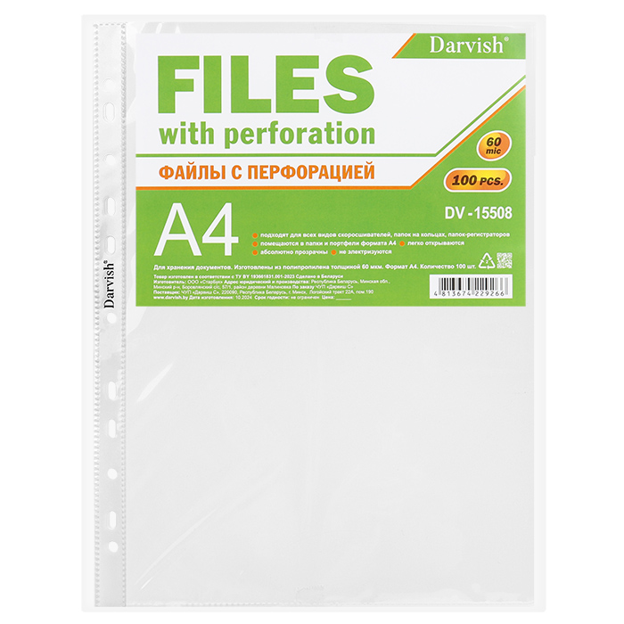 Подходят для всех видов скоросшивателей , папок на кольцах. Формат А4 . 60мкм . Упаковка 100шт -пакет