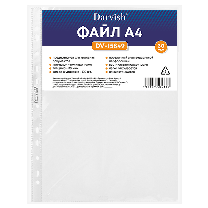 Файл А4 30мкм вертикальная ориентация. Подходит для всех видов скоросшивателей, папок на кольцах, папок-регистраторов. Упаковка по 100шт: пакет 24*31*1см
