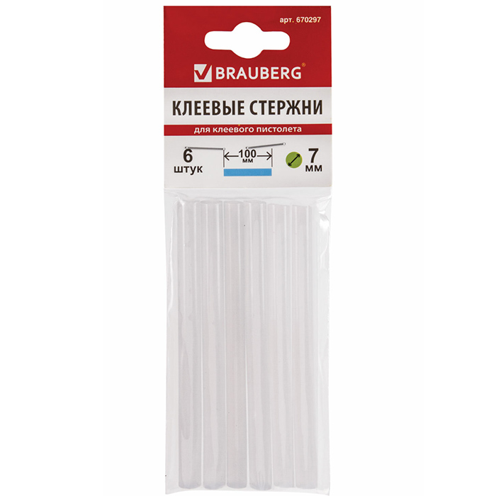 Термоклей прочно и быстро скрепит различные материалы: бумагу, дерево, картон, стекло, пластмассу, металл, кожу, синтетические волокна и т. д. Диаметр клеевого стержня 7 мм и длина 10 см являются самыми востребованными параметрами для выполнения работ. Цвет клеевого стержня белый, с полупрозрачной фактурой. В комплект входит 6 клеевых стрежней, обеспечивающих непрерывный рабочий процесс.