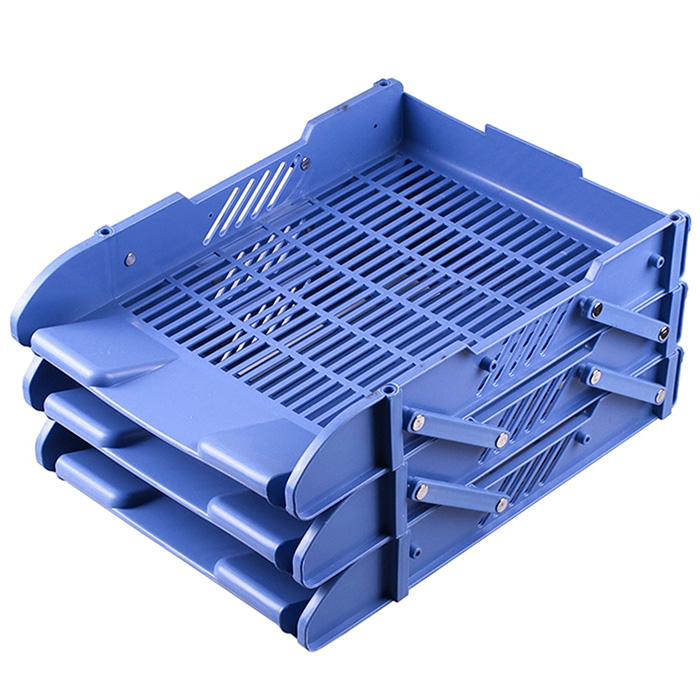 Лоток горизонтальный 3 секции. Цвет-синий.Горизонтальный трехсекционный лоток для бумаг компактно сохранит на рабочем столе документацию, проспекты, каталоги и другую продукцию формата А4. Упаковка - п/э .Размер: 25*15*33см.