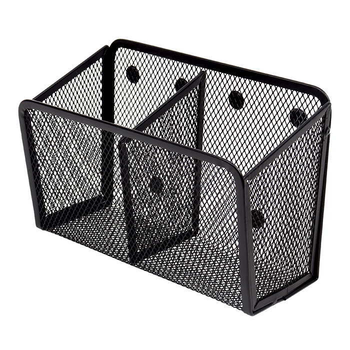 Органайзер на 2 отделения. Для хранения офисных или хозяйственно-бытовых принадлежностей. Крепится к любым металлическим поверхностям, магнитно-маркерным и магнитно-меловым доскам. Цвет: чёрный. Упаковка: кар. коробка.19*13*9см