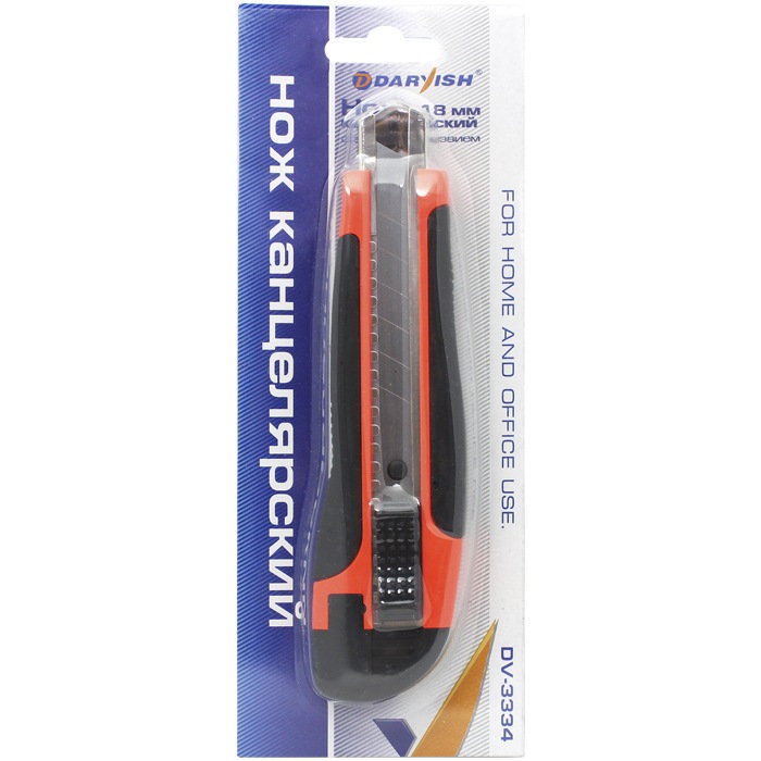 Нож канцелярский 18мм "Darvish" с металлическими направляющими. Цвет: ассорти. Ширина лезвия -18 мм. Размер: 17х4х2 см. Предназначен для широкого спектра бытовых и канцелярских работ. Имеется выдвижное лезвие из высококачественной стали, с механизмом для блокирования лезвия одной рукой, имеет подвижный зажим. С прорезью для безопасного обламывания затупившейся части лезвия. Состав: пластик, металл. Упаковка: блистер с европодвесом 8*21*2 см.