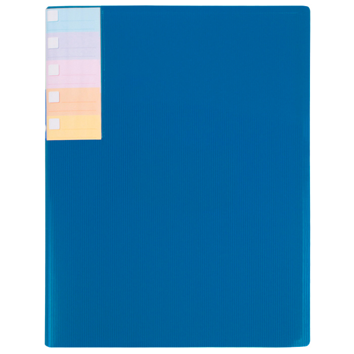 Папка содержит 10 файлов плотностью 40мкм. Внешняя сторона папки имеет оригинальную ребристую фактуру. Изготовлена из полипропилена толщиной 500мкм. На корешке есть карман для маркировки содержимого. Цвет-синий.