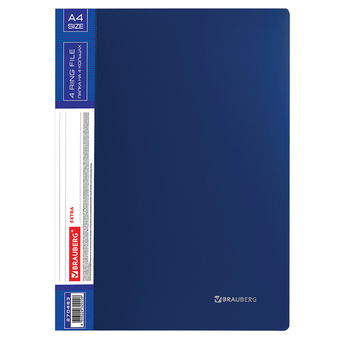 Папка стандартного формата А4 вмещает до 170 листов. Изготовлена из высококачественного пластика толщиной 0,7 мм синего цвета со стандартной фактурой. Допускается влажная обработка поверхности. Внутренняя сторона обложки снабжена прозрачным карманом. Для идентификации содержимого на корешке папки имеется карман. Ширина корешка составляет 25 мм. Папка оснащена четырьмя кольцами, которые обеспечивают надежное хранение документов. В неё можно вставлять файлы или проколотые дыроколом листы и, при необходимости, заменять их на другие. Каждая папка упакована в индивидуальный пакет.