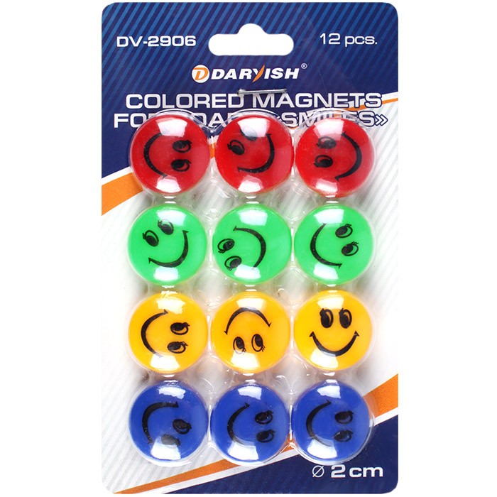 Магниты для доски цветные "Смайлики" d=2см "Darvish" 12шт/уп. Упаковка - карт.блистер с европодвесом 8*12,5см