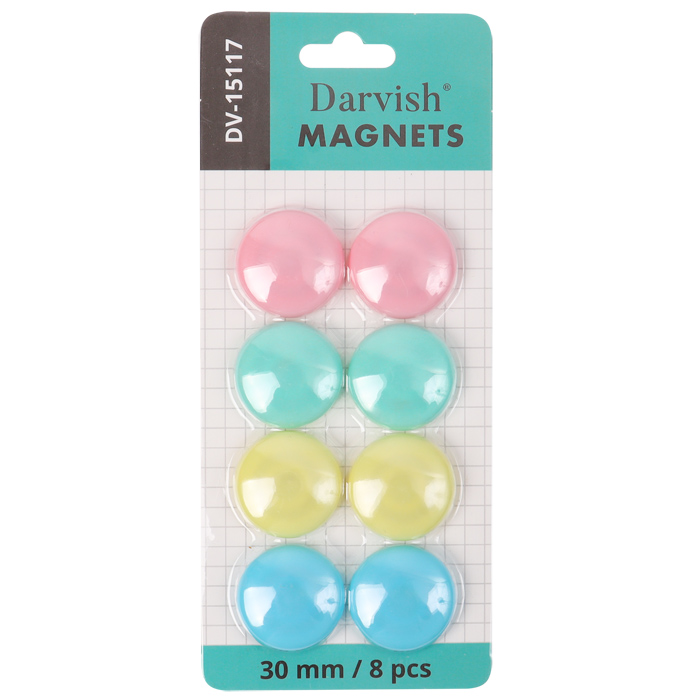Магниты для доски цветные пастельные оттенки: круглая форма , диаметр 30мм, в наборе 8 шт. Упаковка-блистер 7,5*17,5*1см