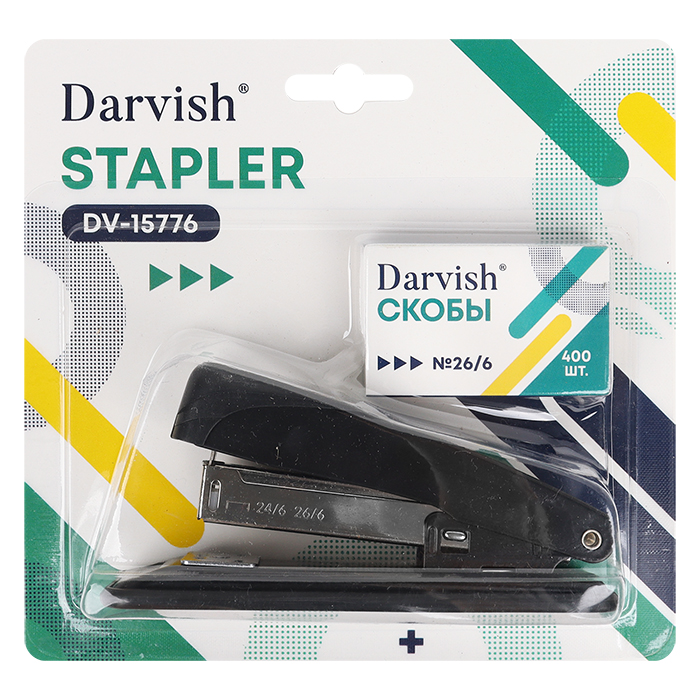 Предназначен для скрепления листов бумаги металлическими скобами , сшивает до 25 листов. В наборе : степлер, скобы -400шт. Цвет: черный. Упаковка: блистер с европодвесом 15,8*15,3*3,5см.