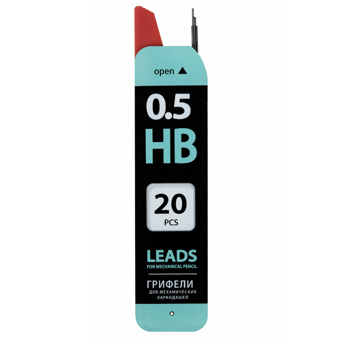 Изготовлены из высококачественных полимерных материалов, обеспечивающих мягкое письмо. Устойчивы к излому. Обладают средней степенью твердости – HB. Длина грифеля составляет 60 мм, а его диаметр - 0,5 мм. 20 штук в упаковке. Поставляются в пластиковой тубе.