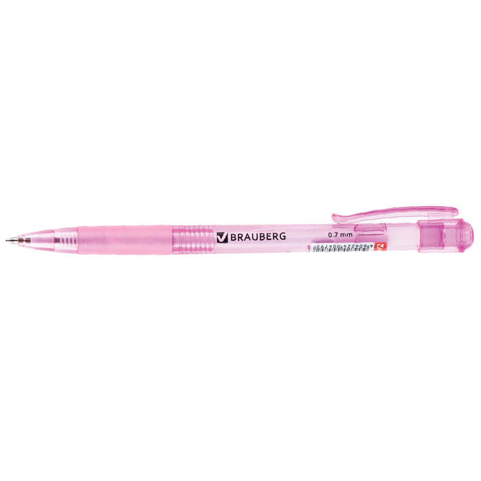 Автоматическая шариковая ручка с корпусом из полупрозрачного пластика в нескольких цветах и резиновым упором для удобства письма. Укомплектована стержнем синего цвета длиной 107 мм. Диаметр пишущего узла, равный 0,7 мм, создает линию письма, равную 0,35 мм.