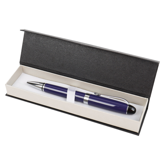 Ручка подар. корпус синий с серебристой отделкой в футляре . Ручка с поворотным механизмом. Стержень шариковый объёмный метал. 98мм. Упаковка: картон. Размер :17,5*2,3*4,5см.