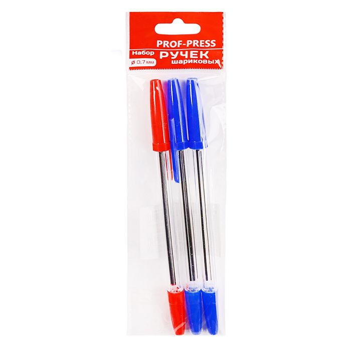 Набор шариковых ручек обеспечивает лёгкое и мягкое письмо. Быстро высыхающие чернила не размазываются и имеют насыщенный цвет. В наборе: синий (2 шт.) и красный (1 шт.) цвета. Прозрачный корпус, диаметр 0,7 мм.