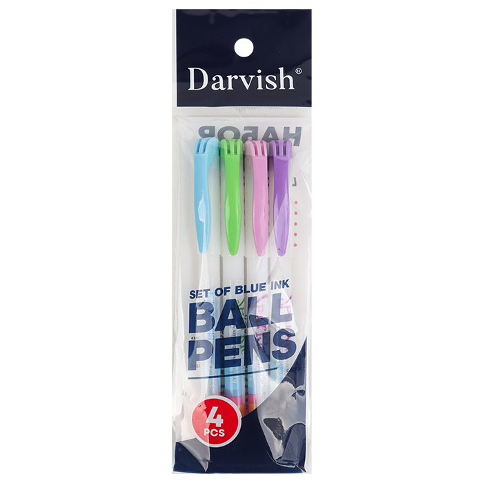 В наборе 4 ручки .Цвет чернил синего цвета. Стержень -132мм . Диаметр пишущего наконечника-0,5мм. Упаковка: пакет с европодвесом 6*15,5*1см
