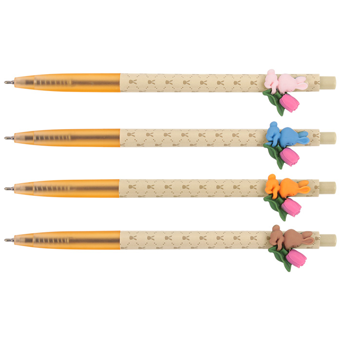 Ручка шариковая автоматическая "Зайка с тюльпаном" корпус бежевый с цветной прозрачной вставкой. Для письма и рисования. Цвет чернил:синий. Пишущий узел:0,5мм. Длина стержня:116мм. Упаковка 36шт: карт. шоу-бокс.15*15*14,5см