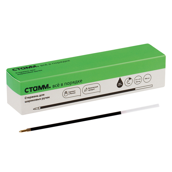 Шариковый стержень «СТАММ» чёрного цвета предназначен для замены исписанного стержня шариковой ручки. Диаметр пишущего узла составляет 1 мм, толщина линии – 0,7 мм. Длина линии письма может достигать 1500 метров. Длина стержня – 152 мм. Износостойкий наконечник и чернила на масляной основе обеспечивают мягкое, ровное и комфортное письмо.