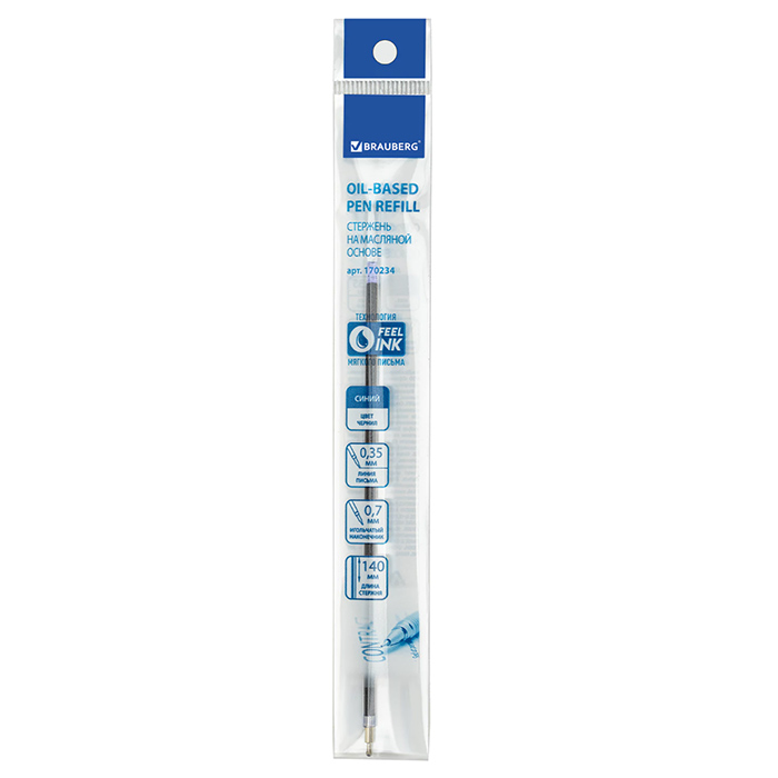 Длина стержня составляет 140 мм. Диаметр пишущего узла 0,7 мм создает ровную линию письма, равную 0,35 мм. Имеет игольчатый наконечник. Цвет чернил - синий. Поставляется в пакете с подвесом.