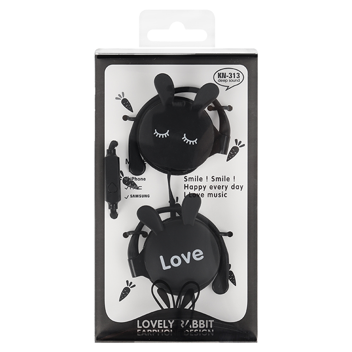 Наушники-зайчики проводные накладные черные. Тип: проводные. Предназначены для прослушивания музыки. Длина провода 120см, микрофон, разъем 3.5мм. Упаковка: пластиковая коробка с европодвесом: 8*14,5*3см