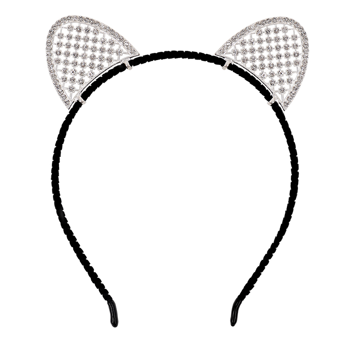 Использовать аксессуар для украшения и закрепления причёски. Подходит для карнавального и праздничного образа. Ободок металлический, декорирован чёрной бархатистой тканью и на него прикреплены ушки в стразах.  Размер 12*14см. Упаковка - блистер 14*16*5,5см.