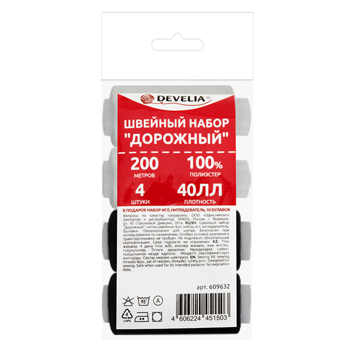 В набор "Дорожный" входит 4 катушки ниток 40 ЛЛ в намотке 200 м черного и белого цветов, иглы для ручного шитья разных размеров – 15 штук, нитевдеватель, 10 булавок. Поставляются в полипропиленовом пакете.