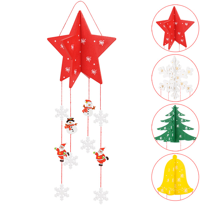 Подвеска новогодняя 3D mix дизайн (Ёлка 21.5*16см , Снежинка 15,5*17,5см, Колокольчик 15,5*16,5см, Звезда 17*17см). Предназначена для украшения интерьера. Изготовлена из дерева с элементами из текстиля. Упаковка пэ.