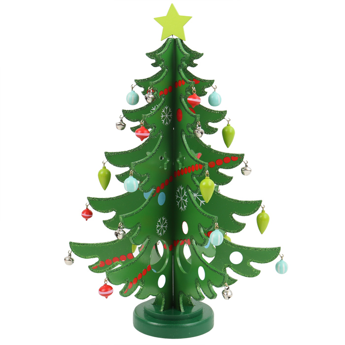 Ёлочка 3D новогодняя деревянная зелёная. Каркас для ёлочки (2 шт.), подставка под ёлочку, миниатюрные украшения на ёлку. Предназначена для украшения интерьера. Изготовлена из дерева с элементами из металла. Комплектность: ёлочка зелёного цвета Н29см на подставке, игрушки 24 шт, бубенцы 12 шт. Упаковка коробка с прозрачной крышкой 24,5*31*3,5см.