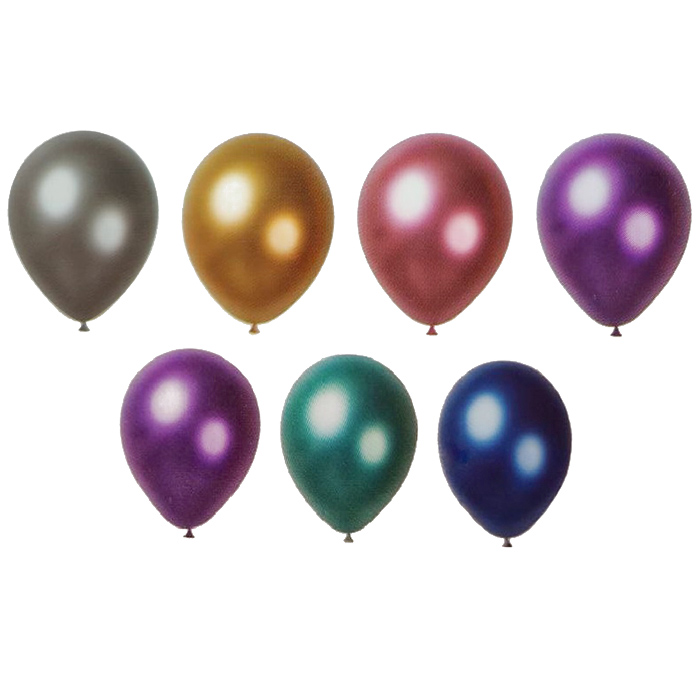 Латексные шары с хромированным покрытием имеют металлический блеск и насыщенные цвета, что делает их особенно привлекательными. Диаметр 5 дюймов (12,7 см) в надутом состоянии. Классическая шарообразная форма. Могут быть наполнены воздухом или гелием. Из-за небольшого размера чаще всего наполняются воздухом. Изготовлены из латекса — это гарантирует прочность и эластичность. Используются для создания арок, гирлянд, букетов из шаров и других декоративных элементов. Идеальны для украшения дней рождений, свадеб, корпоративных вечеринок, детских праздников и других мероприятий. Могут использоваться в различных играх и конкурсах на праздниках; в различных креативных и художественных проектах, таких как создание скульптур из шаров.