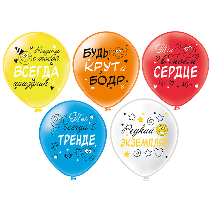 Диаметр шаров — 12 дюймов, что составляет примерно 30 сантиметров, идеальны для украшения помещений или улицы. Подходят для надувании как гелием, так и обычным воздухом, что делает их универсальными в использовании. Изготовлены из латекса — это гарантирует прочность и эластичность. 5 дизайнов.