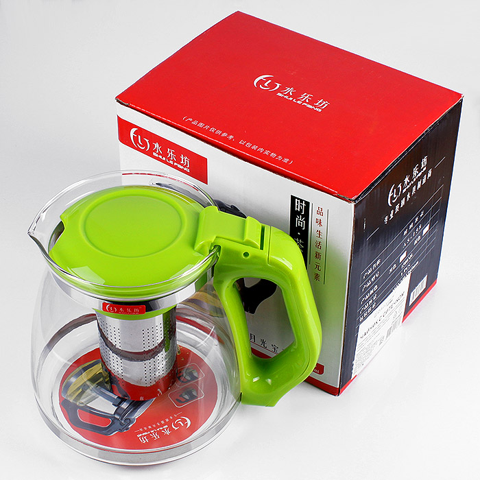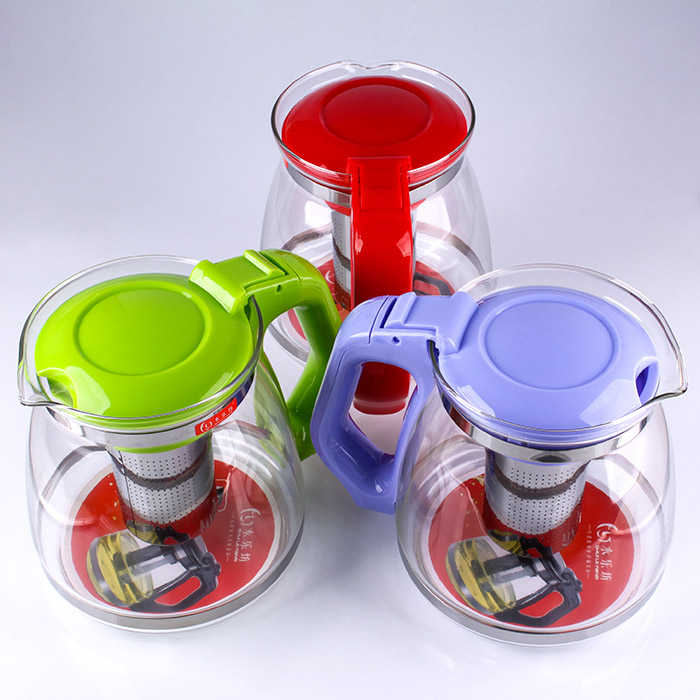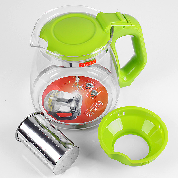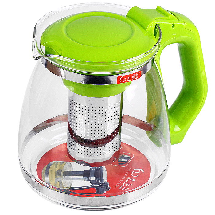 Стеклянный чайник объемом 1500мл, с пластиковой ручкой и ситечком для заваривания чая.