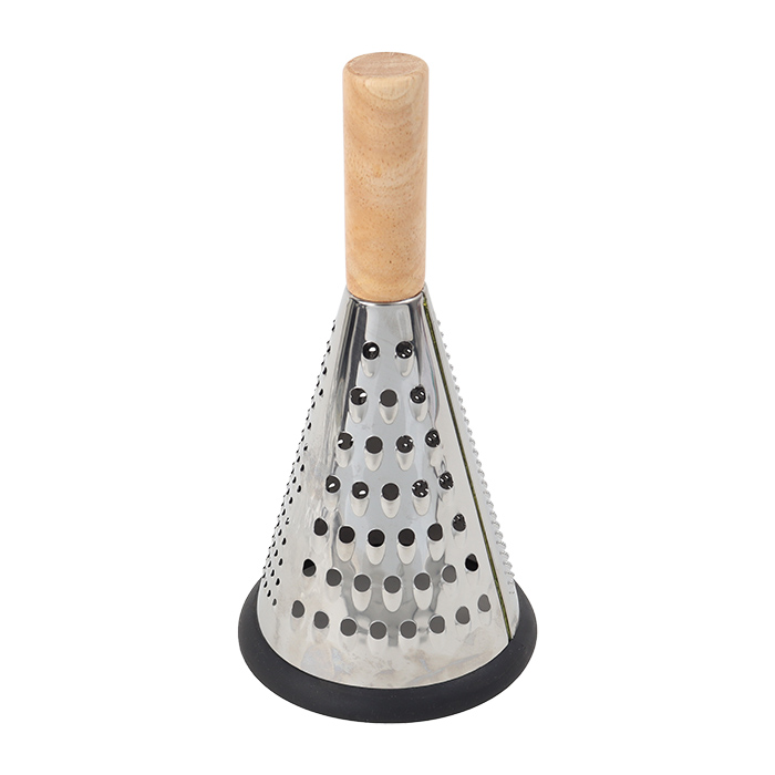 Терка- конус с деревянной ручкой из нержавеющей стали. Резиновая накладка в основании, обеспечивает ей устойчивость и не дает скользить по поверхности стола. 3 грани для разной нарезки. Упаковка: пакет 11,5*24,5см