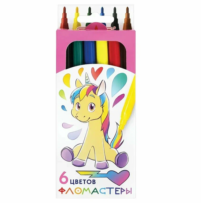 Обладают яркими цветами в количестве 6 штук. Длина корпуса удобной круглой формы составляет 145 мм, а диаметр - 8 мм. Благодаря толщине линии письма 1 мм и диаметру пишущего узла 1,8 мм процесс раскрашивания становится легким.