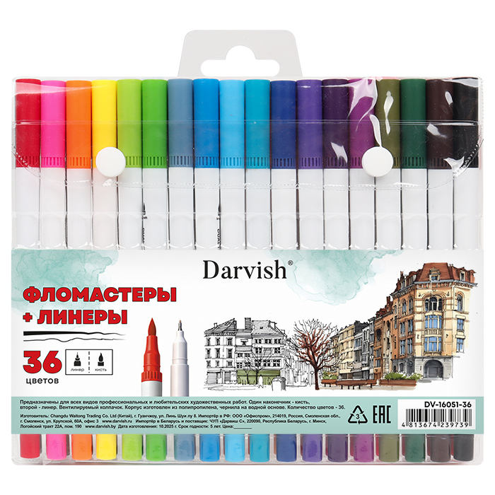 Предназначены для всех видов профессиональных и любительских художественных работ. Один наконечник -кисть, второй-линер.Чернила на водной основе. 36 цветов. Упаковка: ПВХ-футляр на кнопке с европодвесом. 20*18,8*2,5см