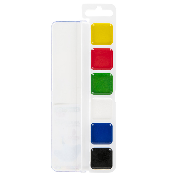 6 ярких насыщенных цветов отлично смешиваются между собой и позволяют создать множество оттенков, обеспечивают однородное окрашивание. Краски быстро высыхают и не портятся со временем. Нетоксичны и безопасны для детей. Выпускаются в пластиковом пенале с европодвесом, прозрачной крышкой, квадратной формой кювет и отделением для кисточки. Упаковка обладает компактными размерами и легким весом.