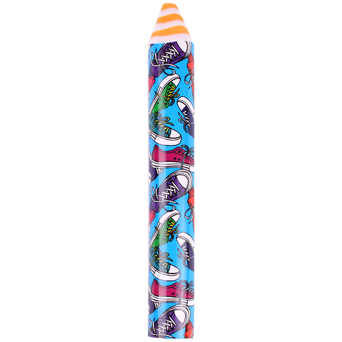Разноцветный ластик в виде карандаша с рисунком "Кеды" обеспечивает мягкое стирание, не оставляет разводов. Цилиндр выполнен из 5цветов, с одной стороны конус, имитирующий заточенный карандаш. Длина ластика 135мм. Диаметр 18мм. Размер шоу-бокса: 10,5*14*14см.