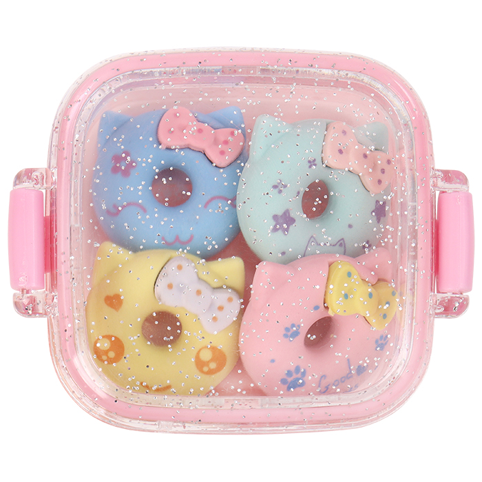 Комплектность : 4 ластика в виде пончика , контейнер 6,5*8*2,5см. .