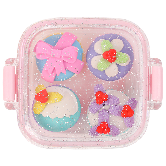 Комплектность : 4 ластика в виде кекса , контейнер 6,5*8*2,5см.