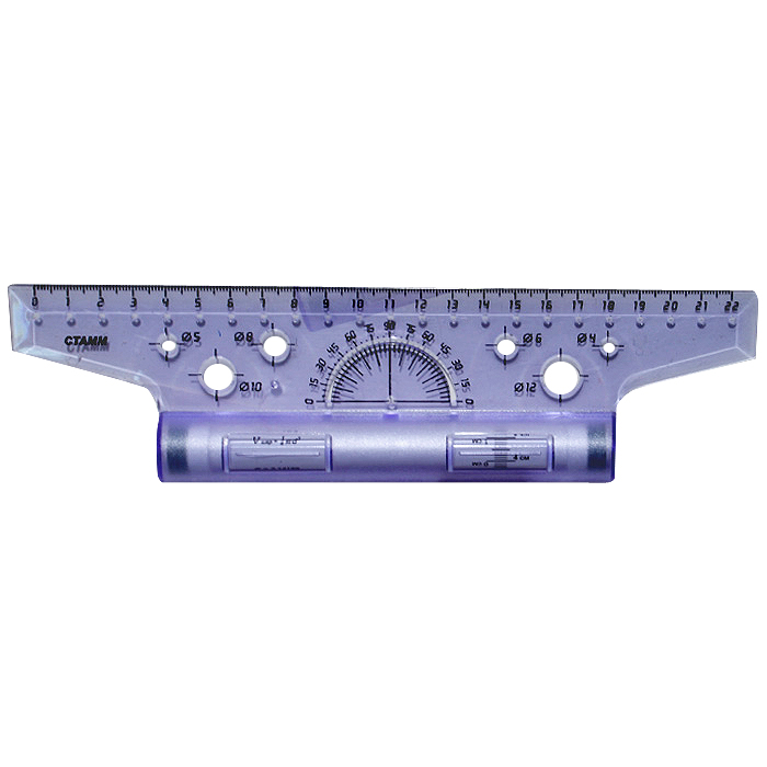 Содержит транспортир 180 градусов и трафареты окружностей.